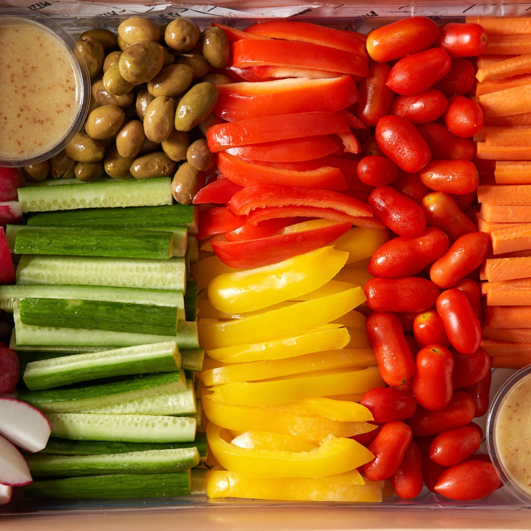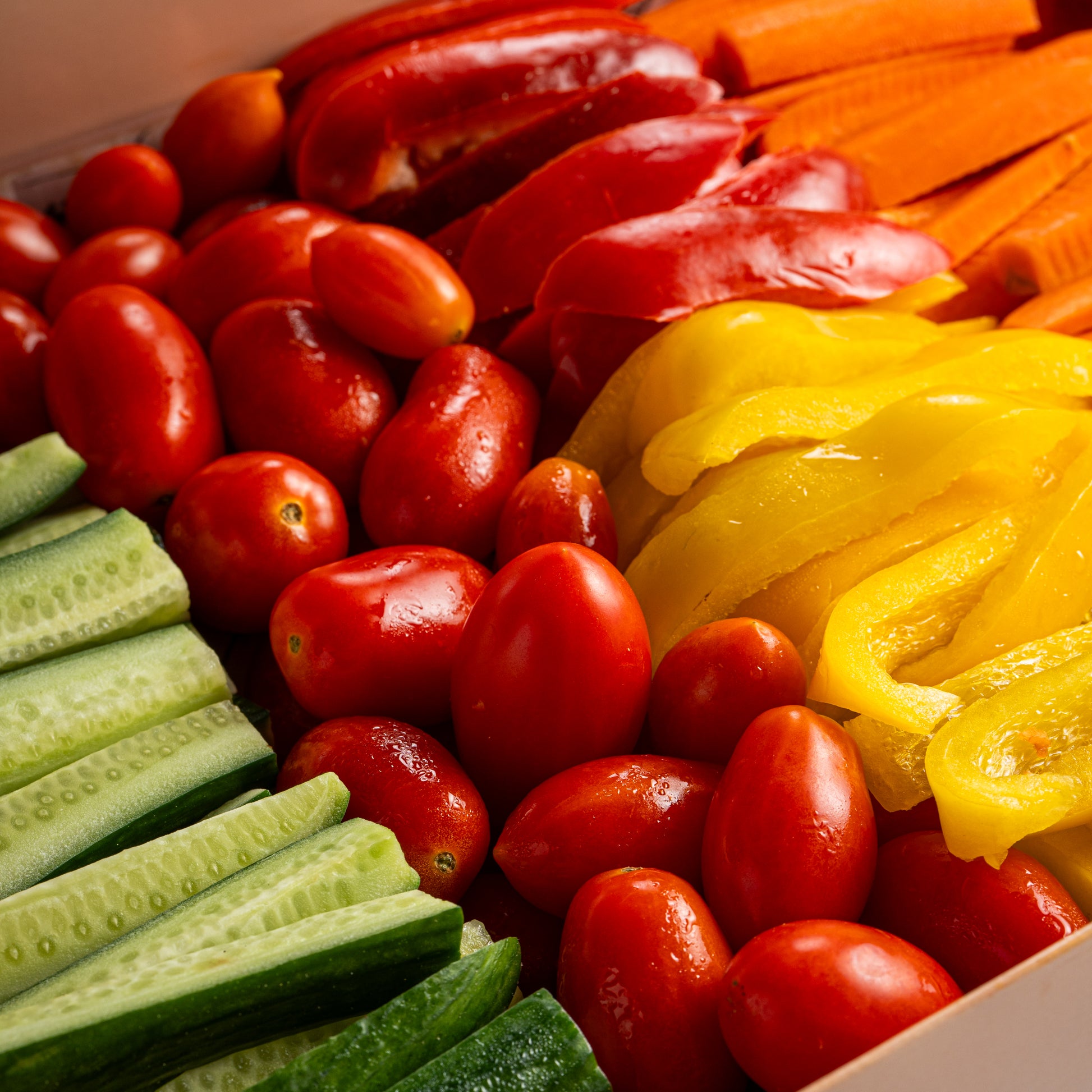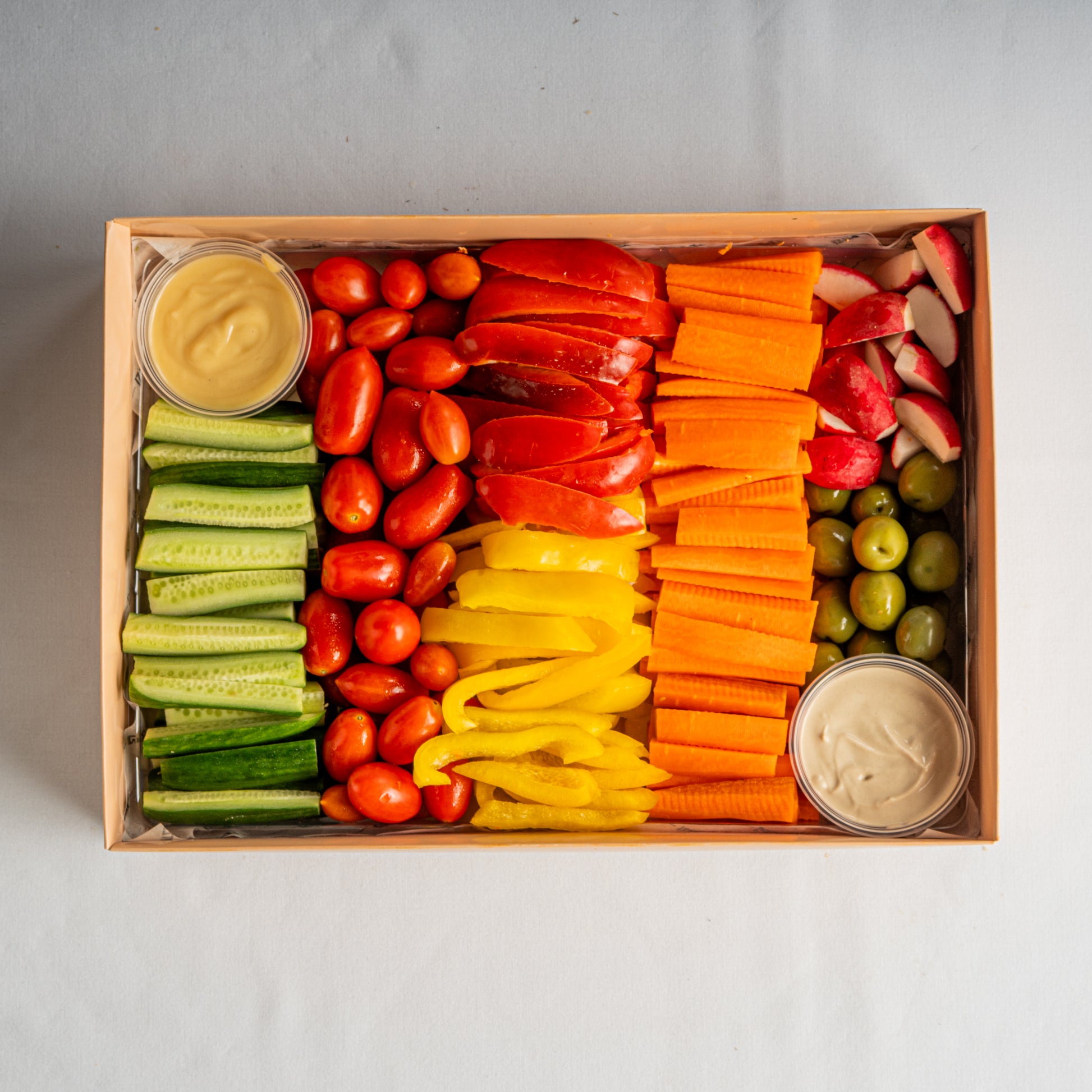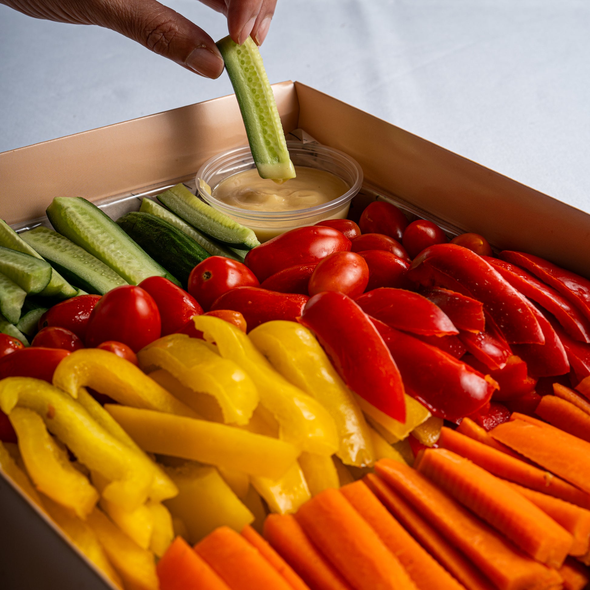 מלפפון, גזר, עגבניות שרי, פלפל צהוב ואדום, צנונית, זיתים ירוקים ורוטב ויניגרט/טחינה