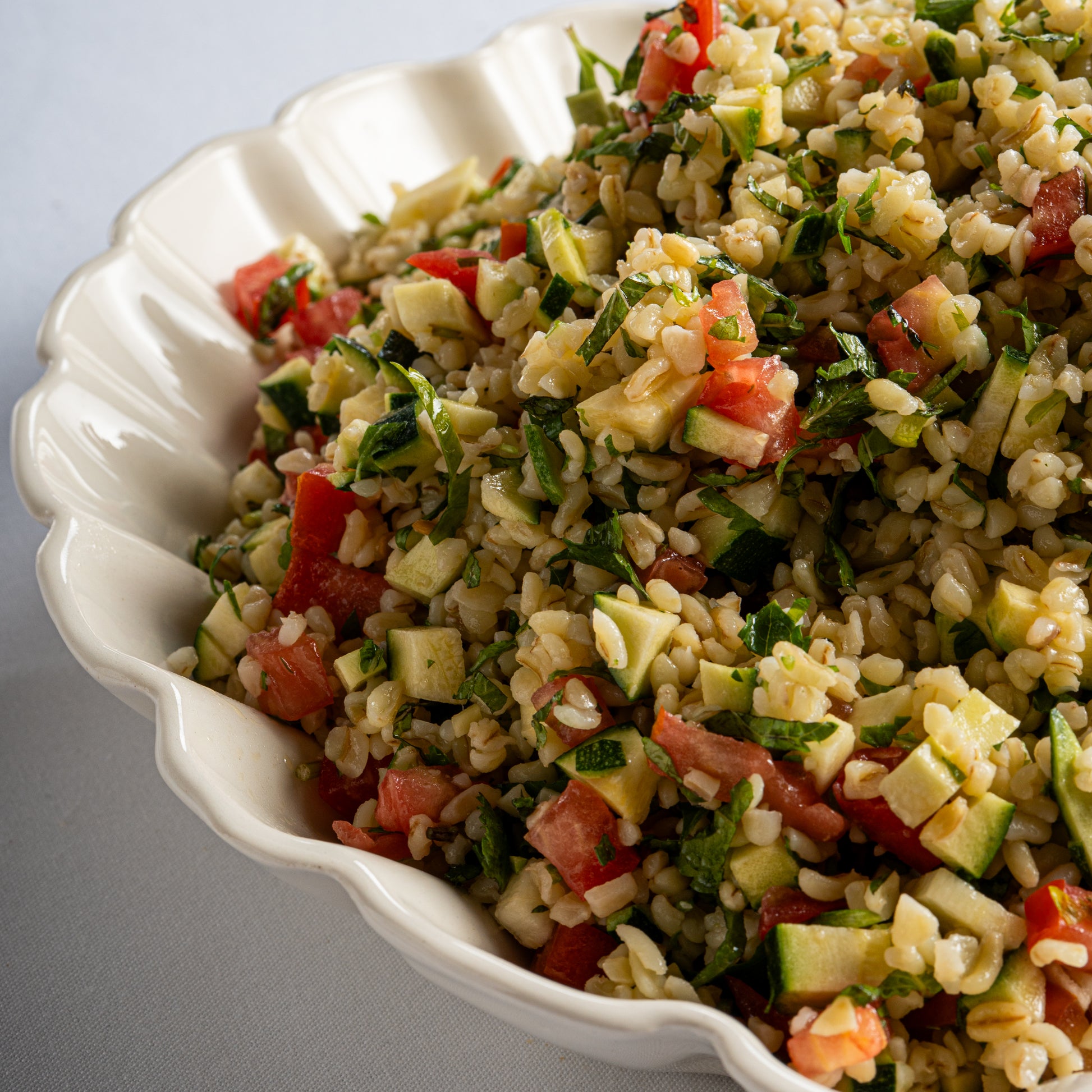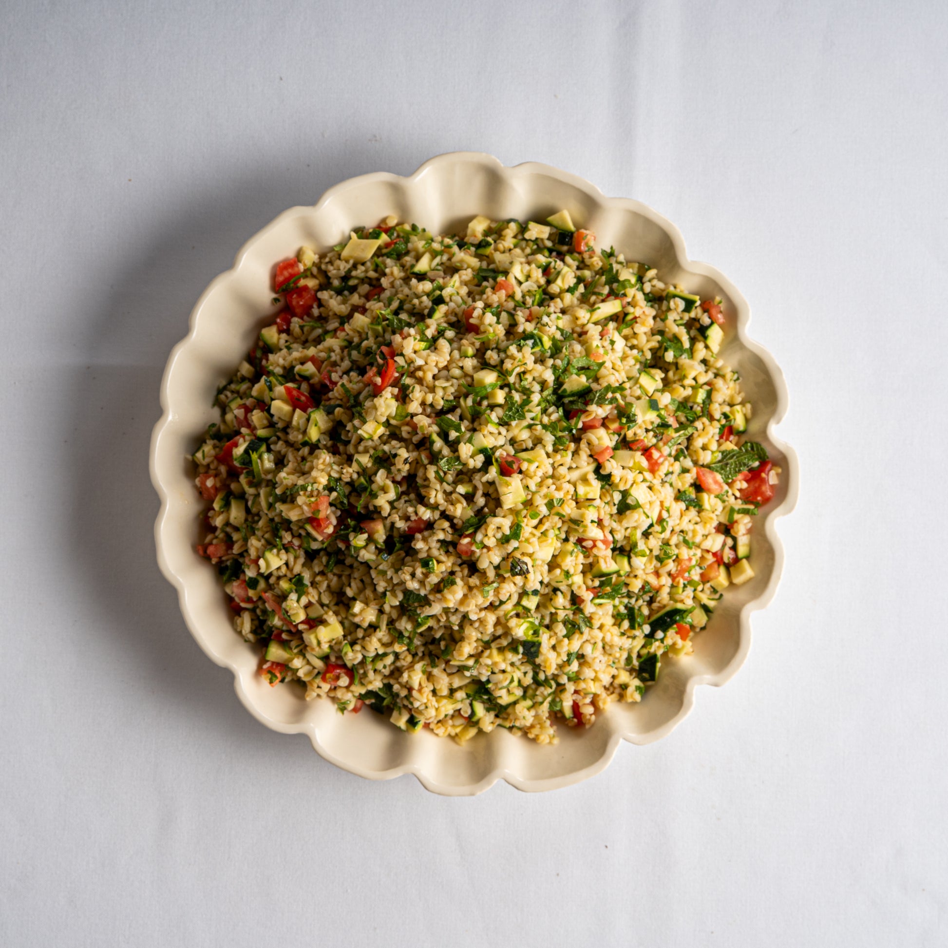 בורגול עבה, זוקיני, קוביות עגבניה, קוביות בטטה צלויה וירק